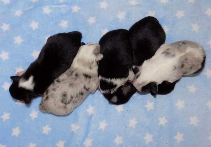 We have 1 blue merle boy, 1 blue merle girl a 2 tricolour girls.